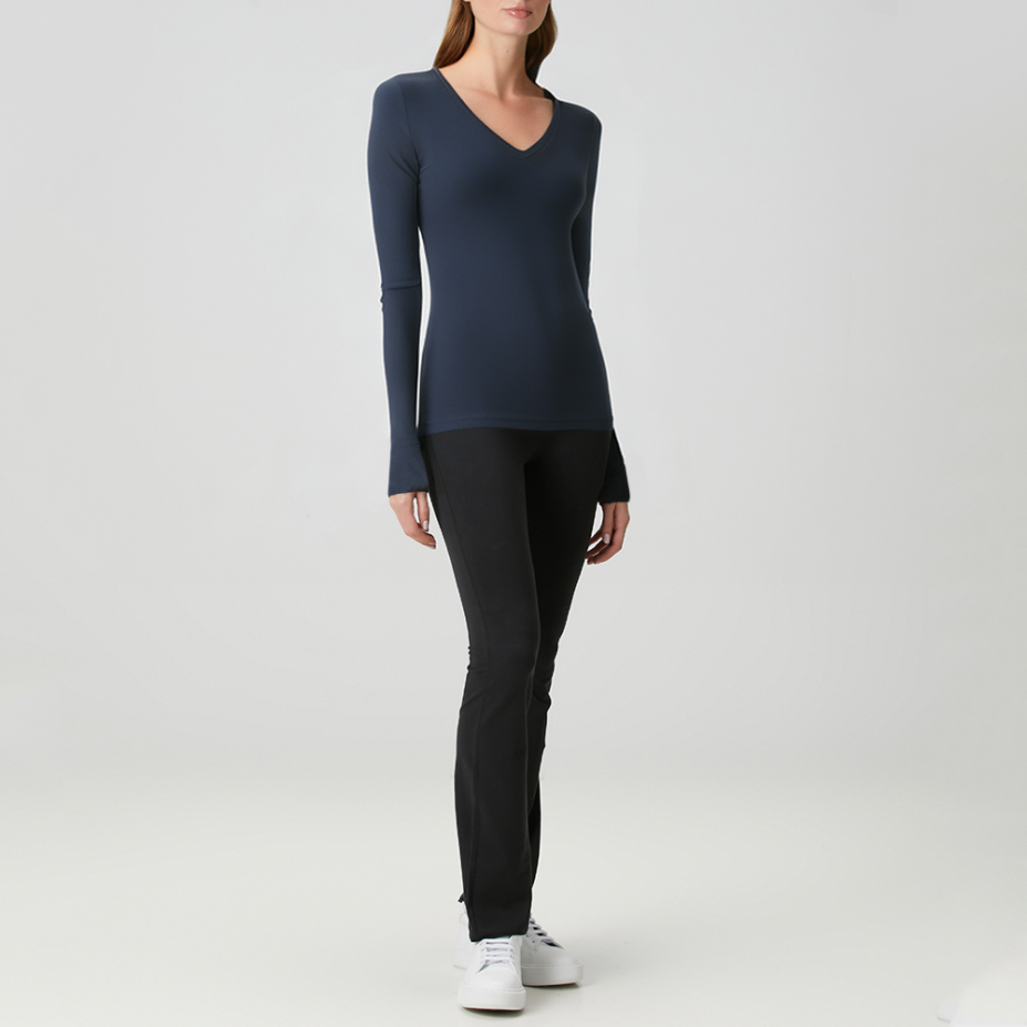 This women's long-sleeved top features a simple, solid-color design that exudes a clean and sophisticated vibe, suitable for various occasions. The V-neckline flatters the neckline, adding elegance and sophistication. The long sleeves provide basic warmth while remaining lightweight and comfortable. The fabric has good elasticity, conforming to the body's curves without being constricting, creating a naturally slimming effect. Whether worn alone or as a base layer, it effortlessly showcases a refined and capable everyday style.