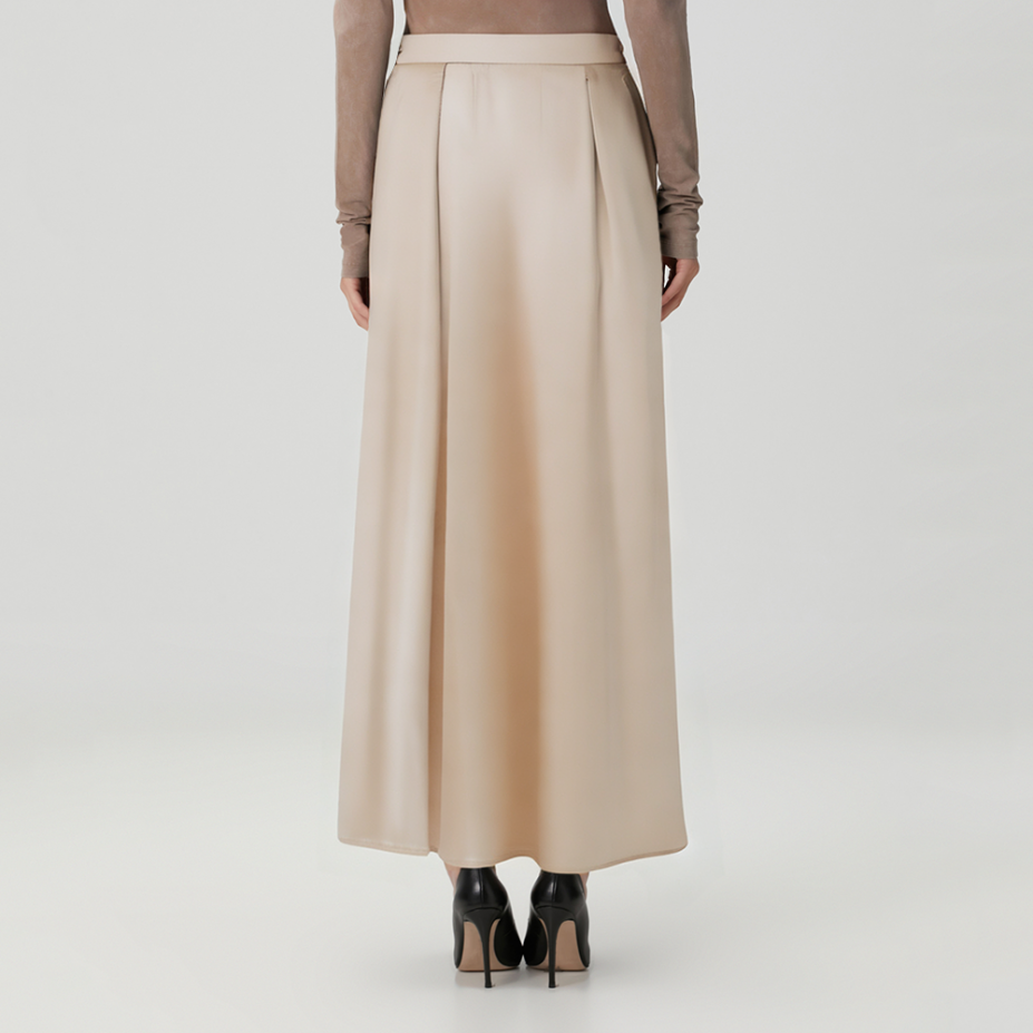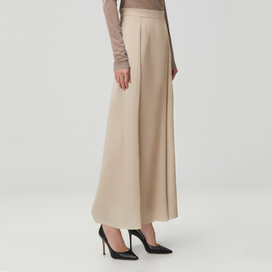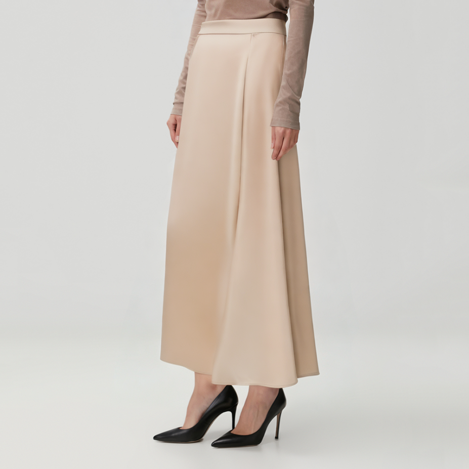 This women's skirt features an A-line design that naturally contours the waist and creates an elegant silhouette. Pleated details add layered, soft movement, and enhance the overall look. The satin fabric has a delicate sheen, creating a luxurious feel and a smooth drape, enhancing the wearer's elegance. The loose fit provides comfortable movement, and the side zipper allows for easy on and off while maintaining a clean, flowing silhouette. The overall style is simple yet sophisticated, perfect for everyday wear, work, or evening wear, effortlessly evoking a feminine and elegant look.
