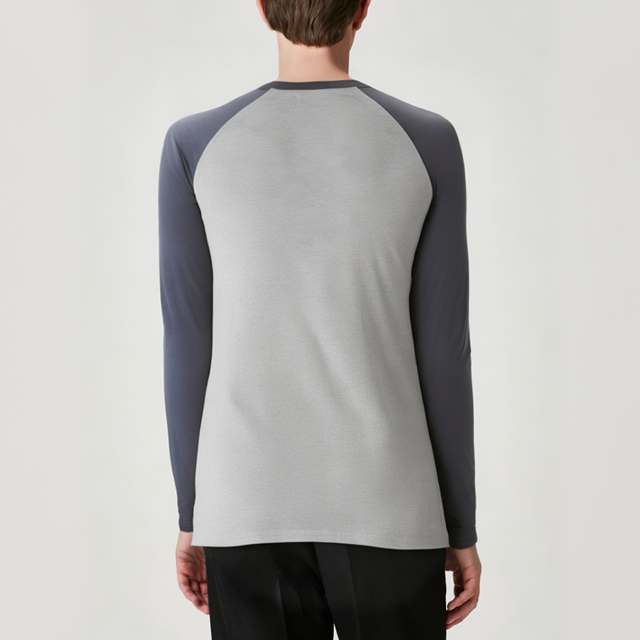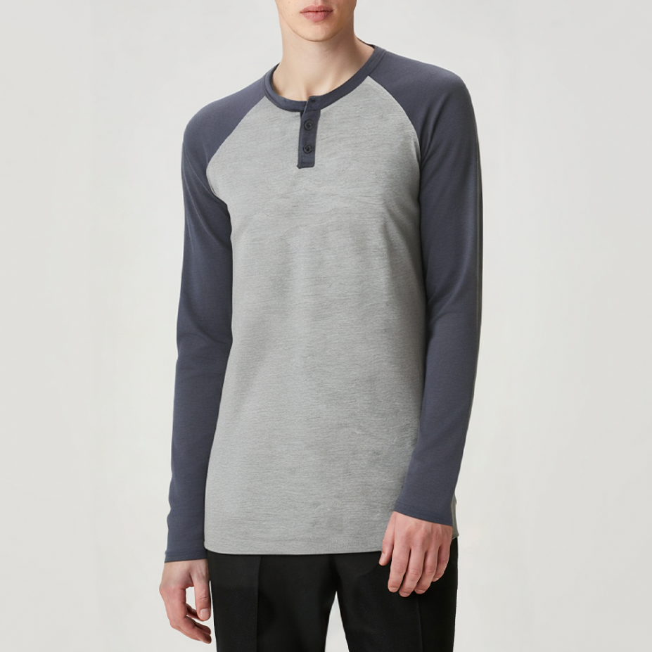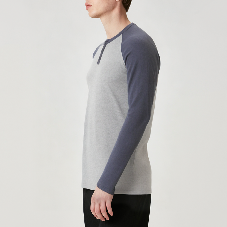 This men's long-sleeved top features a plain base with contrasting color panels for added depth. The round neckline and button placket create a simple yet detailed design. The regular fit is comfortable for all body types. The overall style combines a casual and urban feel, perfect for everyday wear, casual gatherings, or light outdoor activities. It pairs effortlessly with jeans, casual pants, or sweatpants, creating a sophisticated and stylish look.