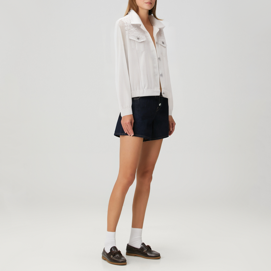 This women's jacket features a classic denim design, accented with pearls for an elegant and refined finish. The lapel and button closure make it easy to put on and take off, while also showcasing a vintage and elegant style. The chest pockets are both practical and decorative, adding dimension to the overall look. The overall tailoring is versatile, perfect for both casual outings and everyday commuting, creating a stylish and elegant look.