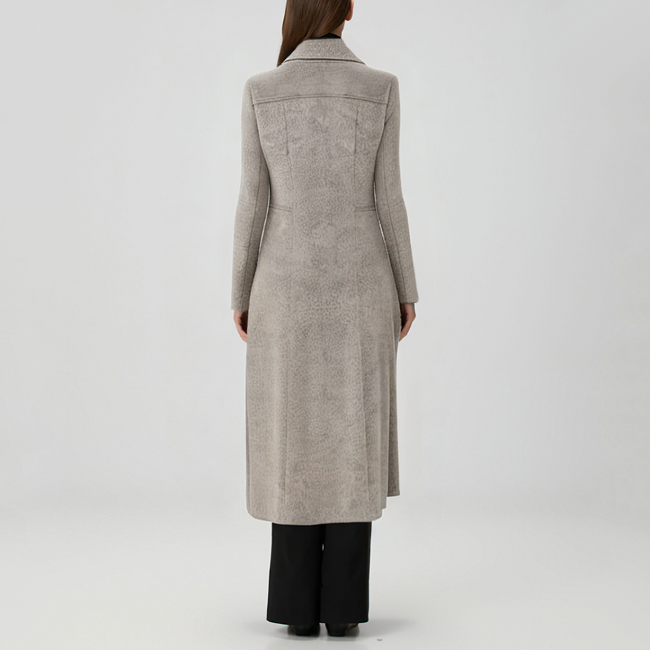 This women's trench coat features a classic notched lapel design, creating an elegant, flattering neckline. The long sleeves are versatile and feature a double-breasted closure, adding a vintage touch while remaining easy to slip on and off. The loose, flowing hem creates a light, comfortable feel, allowing for layering and layering, perfect for everyday commuting or casual outings. Its minimalist yet refined design combines style and practicality, making it a versatile wardrobe staple.